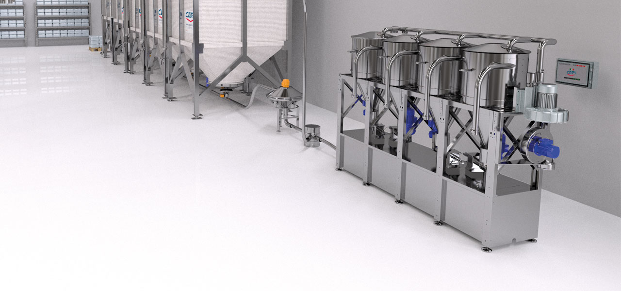Silos can be equipped with insulation, climatization and dehumidification systems, and loaded directly from truck, or from other silos, or from bag and big bag dumping stations. Single or multiple automated extraction and fluidization for accurate FIFO management. Sifting systems to ensure food security. CIP washing system for a complete hygienization of tanks and pipes.